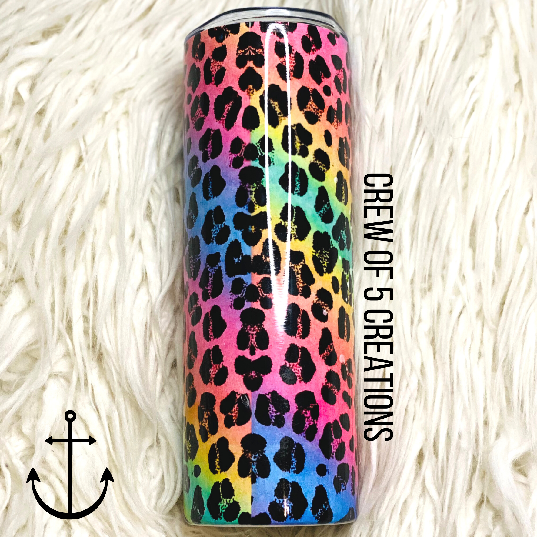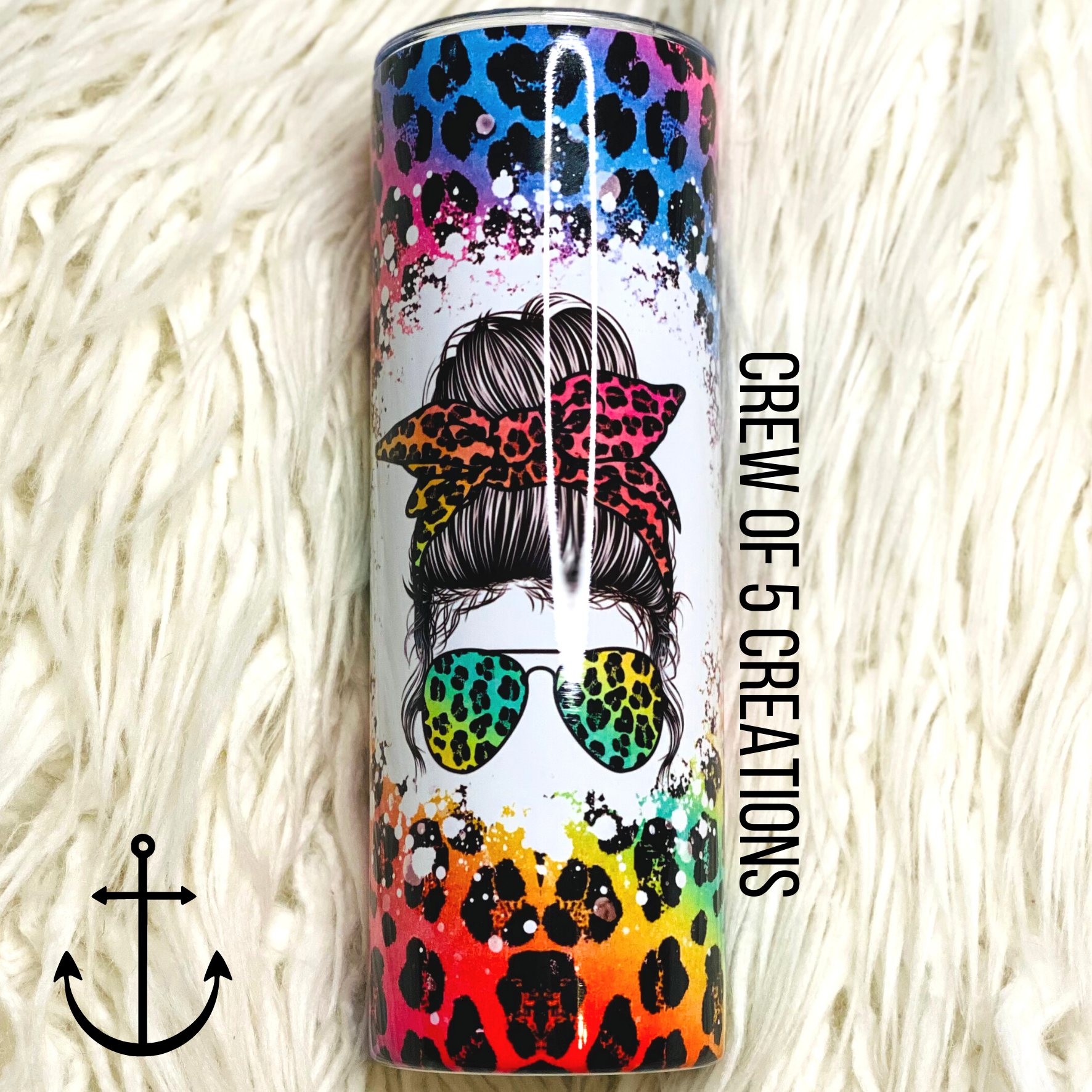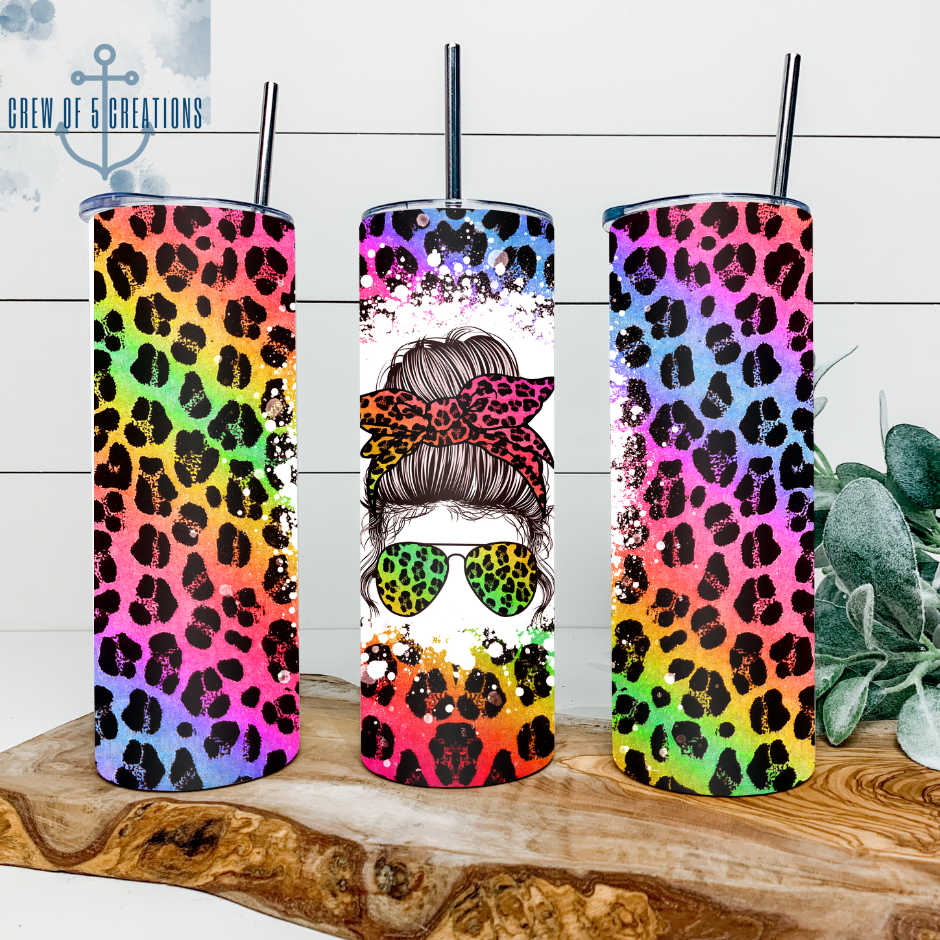 Leopard Rainbow Messy Bun 20 oz Tumbler